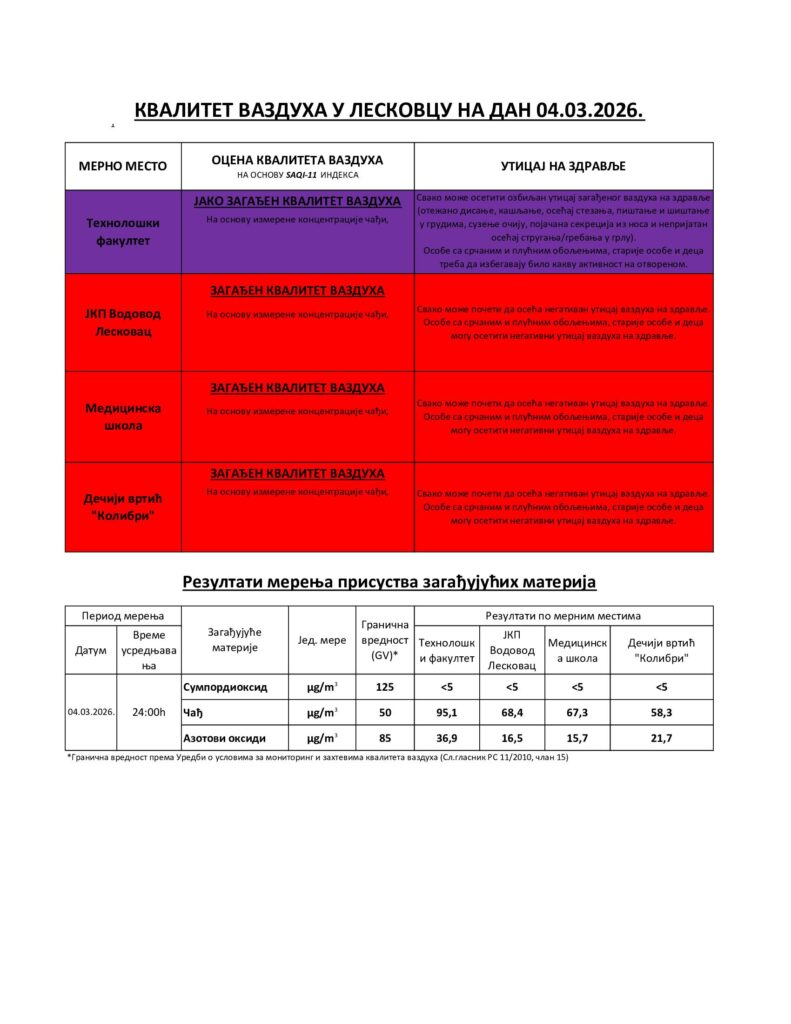 КВАЛИТЕТ ВАЗДУХА У ЛЕСКОВЦУ НА ДАН 04.03.2026. ГОД.