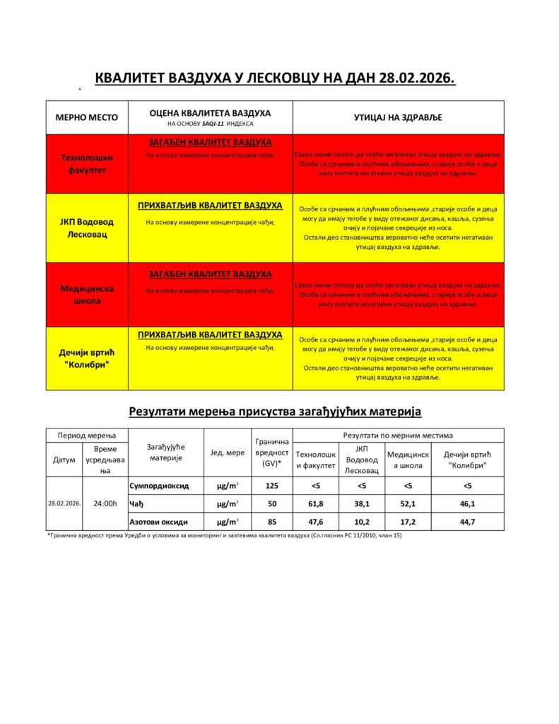 КВАЛИТЕТ ВАЗДУХА У ЛЕСКОВЦУ НА ДАН 28.02.2026. ГОД.
