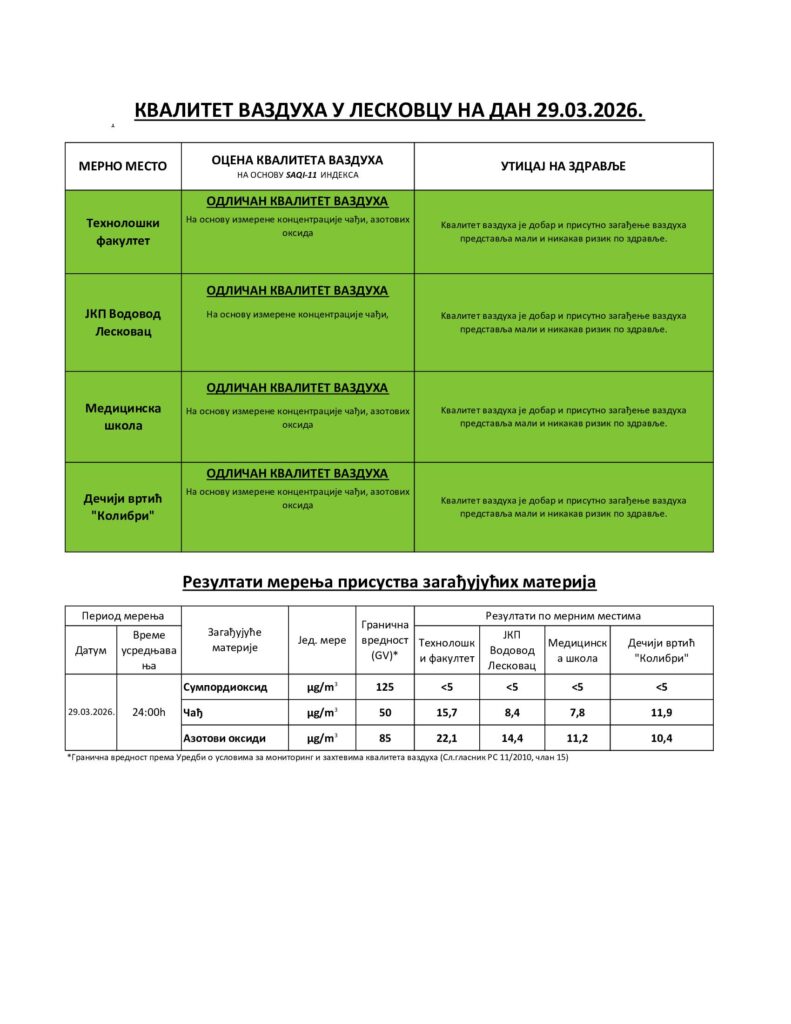 КВАЛИТЕТ ВАЗДУХА У ЛЕСКОВЦУ НА ДАН 29.03.2026. ГОД.